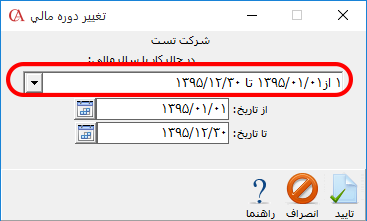نکته: شما میتوانید عملیات انتقال اطلاعات را به تعداد نامحدود انجام دهید و در هر بار انتقال با توجه به تغییرات داده شده، سند افتتاحیه بروز میشود. پس از انتقال به دوره مالی جدید جهت ورود به دوره مالی به وسیله Alt+m میتوانید دوره مالی را انتقال دهید یا از منوی عملیات روزانه > عملیات پایان دوره مالی > تغییر دوره مالی را انتخاب کنید. در پنجره بازشده میتوانید دوره مالی مورد نظر خود را انتخاب کرده، وارد آن دوره مالی شوید.