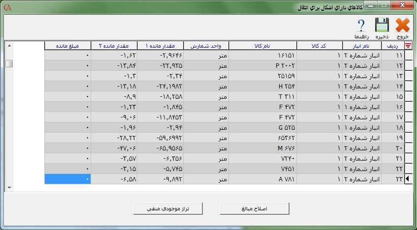 سپس دکمه تایید را فشار دهید. نکته: در زمان انتقال چنانچه کالاهای دارای موجودی منفی مقداری یا مبلغی داشته باشید و انتقال حسابها را با مانده انتخاب کرده باشید، لیست این کالاها نمایش داده میشود و سیستم اجازه انتقال را به شما نمیدهد. برای اصلاح موجودی منفی مقداری کالا، بر روی دکمه تراز موجودی منفی و برای اصلاح موجودی منفی مبلغی کالا، بر روی دکمه اصلاح مبالغ کلیک کنید و در لیست حساب باز شده، حساب تعدیل موجودی را انتخاب نمایید.