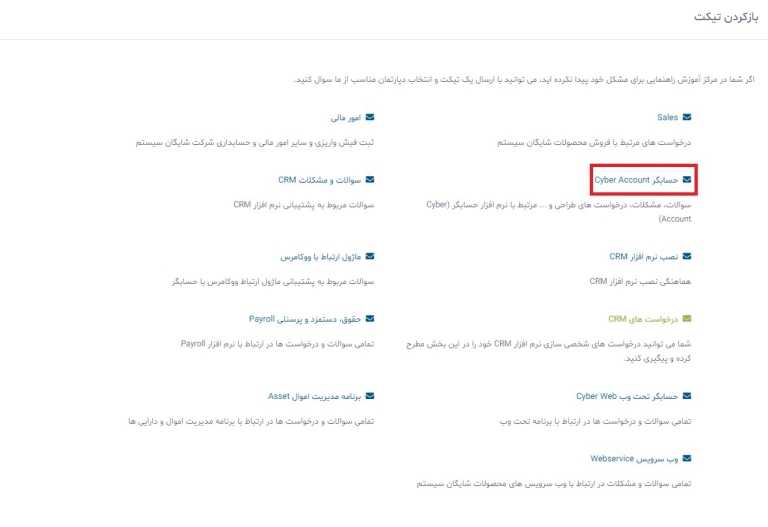 در فرم باز شده بخش مورد نظر برای ثبت تیکت را انتخاب نمایید. به عنوان مثال در صورتی که قصد دارید در زمینه برنامه حسابگر تیکتی را ثبت نمایید، گزینه “حسابگر Cyber Account ” را انتخاب نمایید.