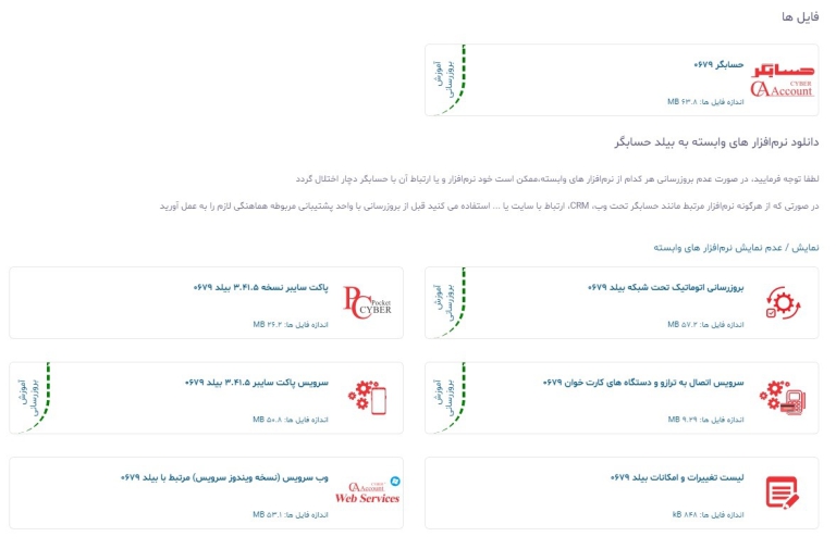 پس از نمایش فایل های مورد نظر (به روز رسانی حسابگر، به روز رسانی پاکت سایبر) بر روی فایل به روز رسانی کلیک نمایید و طبق آموزش، نرم افزار خود را به روز نمایید.