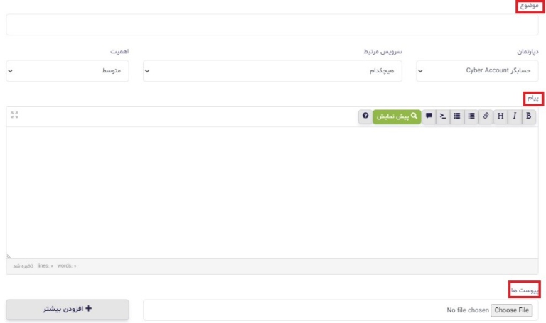 پس از باز شدن محیط تیکت در قسمت موضوع، موضوع تیکت خود را نوشته و در قسمت پیام توضیحات مربوطه را تایپ نمایید.